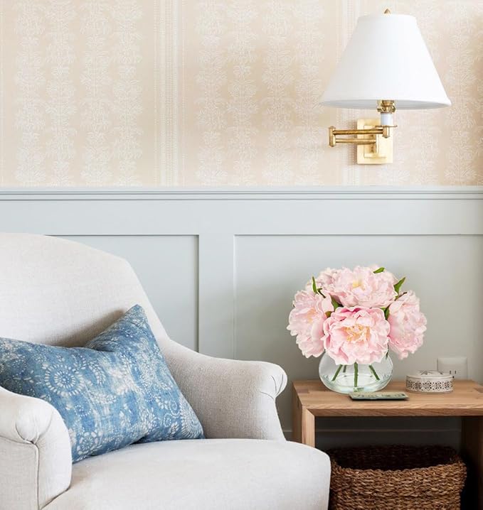 Hollyone Pink Peonies Artificial Flowers with Vase Faux Flowers Peony Fake Flowers Silk Flower Arrangements in Glass Vase with Faux Water for Home Decor Bathroom Table Centerpiece Shelf Decorations