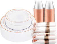 DaYammi 210PCS Rose Gold Plastic Dinnerware Set for 30 Guests, Valentine's Day Plates for Party, Include: 30 Dinner Plates, 30 Dessert Platos, 30 Pre Rolled Napkins with Rose Gold Silverware, 30 Cups