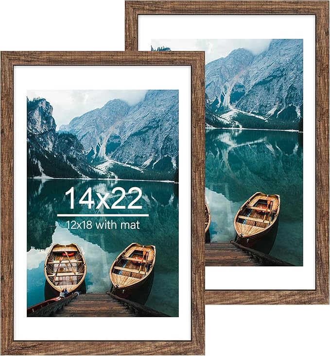 14x22 Picture Frame Set of 2, Rustic Brown Wood Style - Display 14 x 22 Picture without Mat or 12x18 Picture with Mat, Wall Mounting Horizontal and Vertical