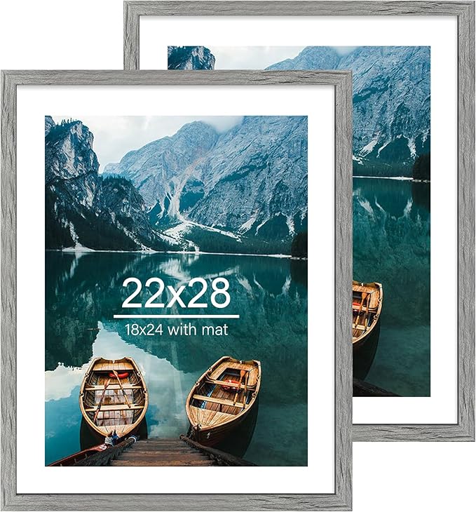 22x28 Frame Set of 2, Rustic Grey Wood Style - Display 18x24 Picture Frame with Mat or 22 x 28 Poster Frame without Mat, Wall Mounting Horizontal and Vertical