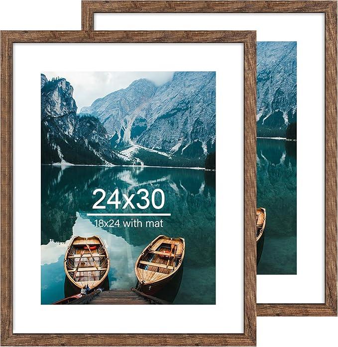 24x30 Frame Set of 2, Rustic Brown Wood Style - Display 18x24 Picture Frame with Mat or 24 x 30 Poster without Mat, Wall Mounting Horizontal and Vertical