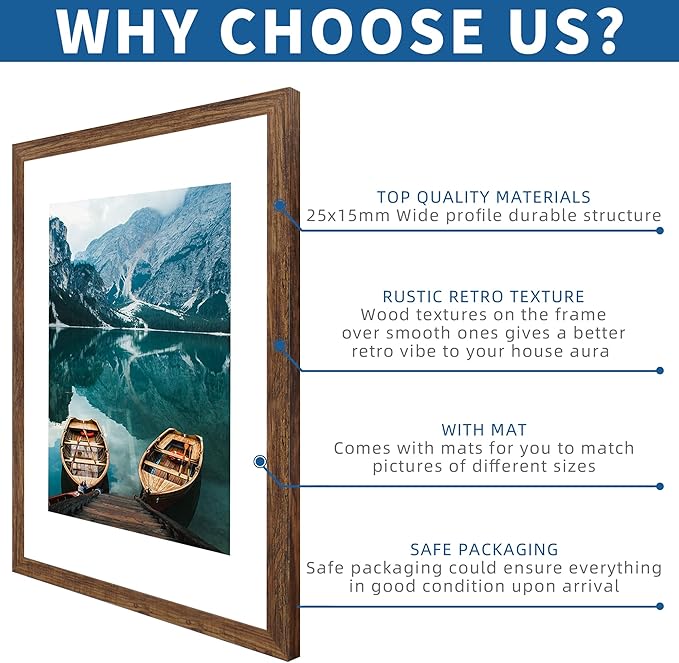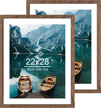 22x28 Frame Set of 2, Rustic Brown Wood Style - Display 18x24 Picture Frame with Mat or 22 x 28 Poster Frame without Mat, Wall Mounting Horizontal and Vertical