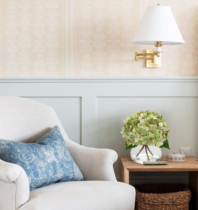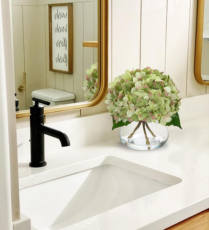 Hollyone Hydrangea Artificial Flowers with Glass Vase Dark Green Silk Faux Flowers Arrangements in Vase with Faux Water Fake Floral Bulk Bouquet for Home Decor Table Centerpiece Decorations