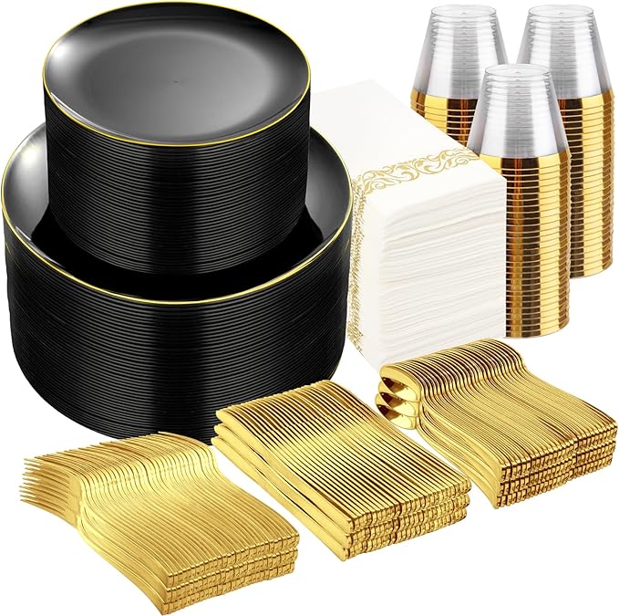 700PCS Black and Gold Disposable Dinnerware Set - Includes 100 Black Plastic Plates, 100 Dessert Plates, 100 Gold Plastic Silverware Set, 100 Cups 9 OZ, 100 Napkins Ideal for Wedding Party Birthday
