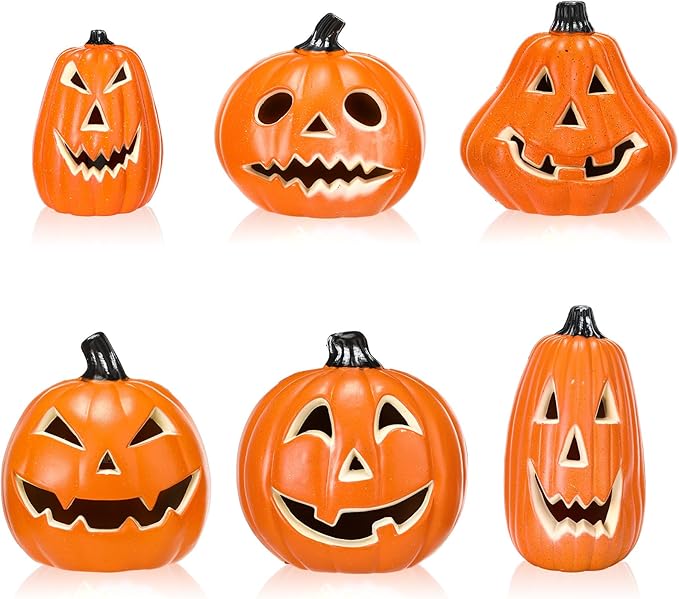 6 Pcs Halloween Pumpkin Lantern Set Light up Pumpkin Lamp LED Light Orange Halloween Decoration for Porch Front Door Outdoor Party Holiday Supplies (Orange)