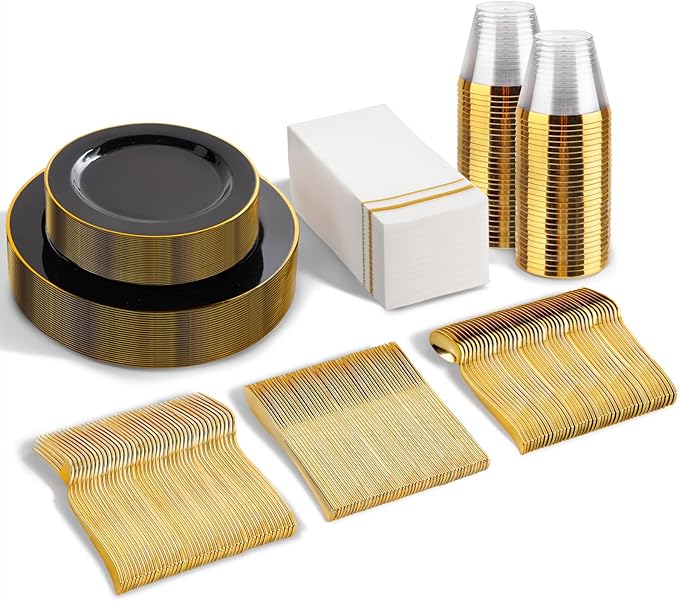 SUT 175 Piece Black and Glod Plastic Dinnerware Set for 25 Guests, Disposable Plastic Plates, Include: 25 Dinner Plates, 25 Dessert Plates, 25 Pre Rolled Napkins with Silver Silverware, 25 Cups