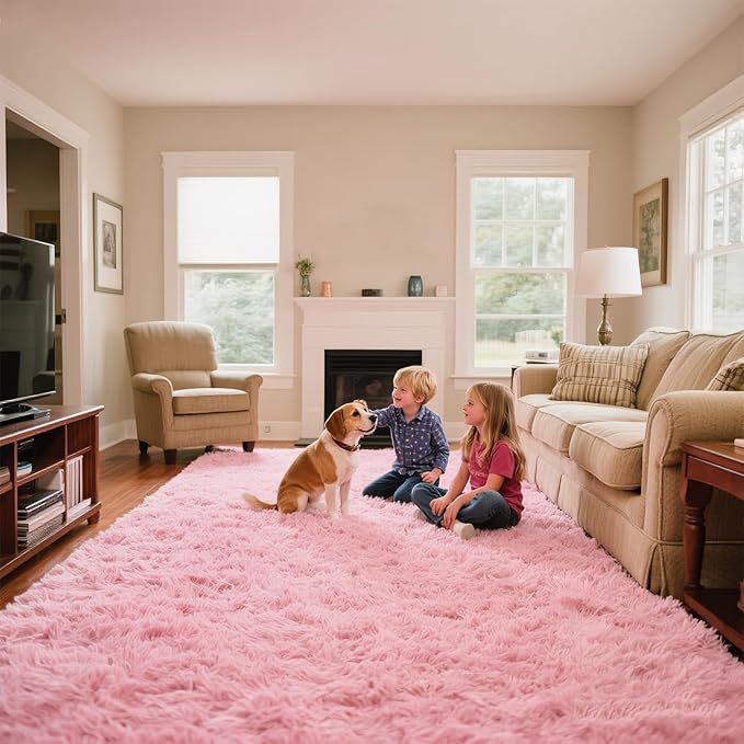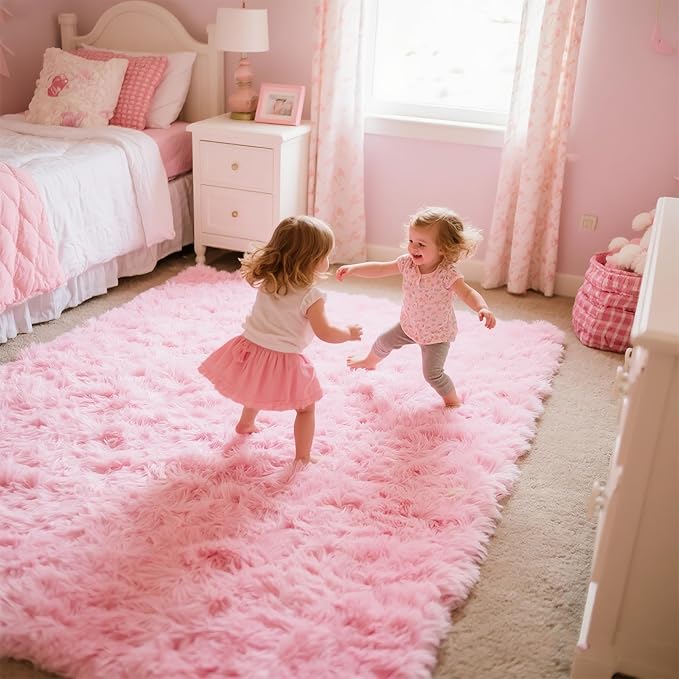 Pink Area Rugs for Girls Bedroom, 9x12 Fluffy Fuzzy Shaggy Carpet for Kids Playroom Nursery Living Room, Thick Soft Plush Mat for Kids Baby Boys Teen Dorm Home Decor Aesthetic