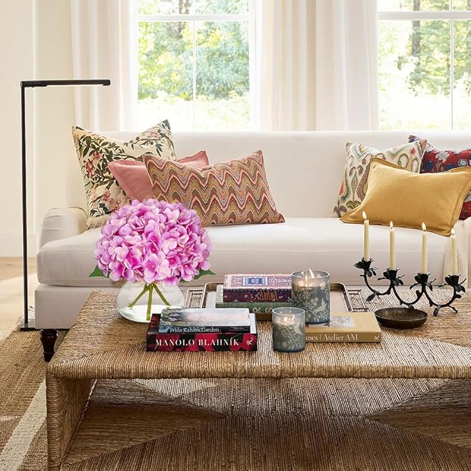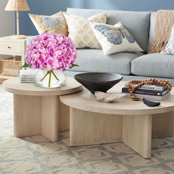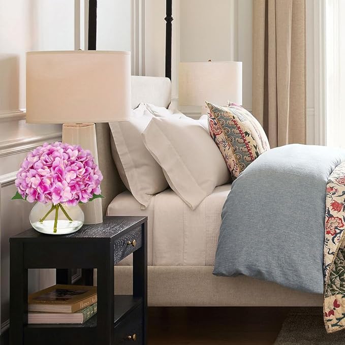Hollyone Hydrangea Artificial Flowers with Glass Vase Purplish Pink Silk Faux Flowers Arrangements in Vase with Faux Water Fake Floral Bulk Bouquet for Home Decor Table Centerpiece Decorations