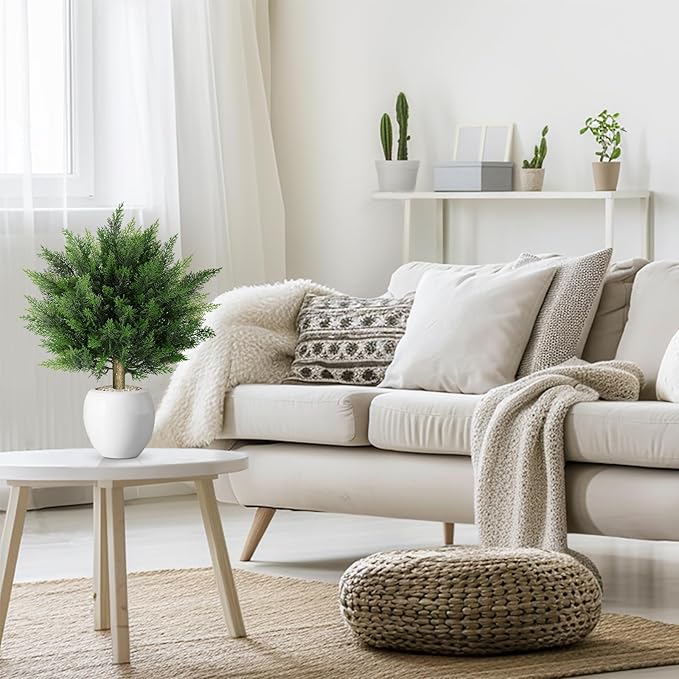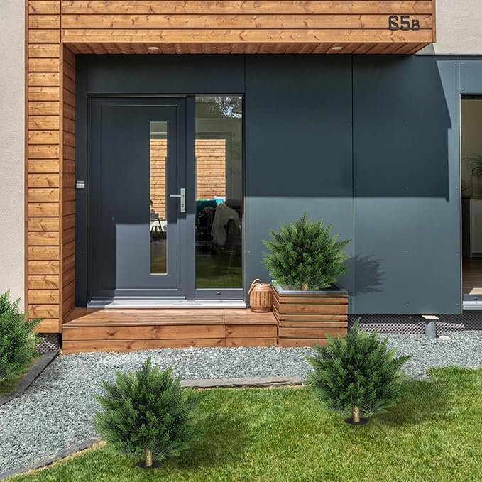 19.69 Inch 2 Set Artificial Cypress Topiary Tree, Outdoor Indoor Faux Boxwood Bush Plants, Fake Cedar Potted with Ground Spike for Home Front Porch Decor Outside Garden
