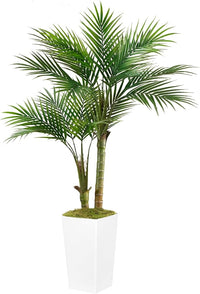 Fake Palm Tree 5FT - Artificial Plants with White Tall Planter, Faux Tropical Golden Cane Palm Tree with Two Trunks and 18 Realistic Palm Leaves, Indoor Floor Plants for Living Room Office Decor