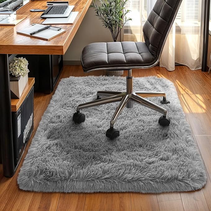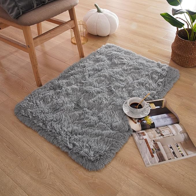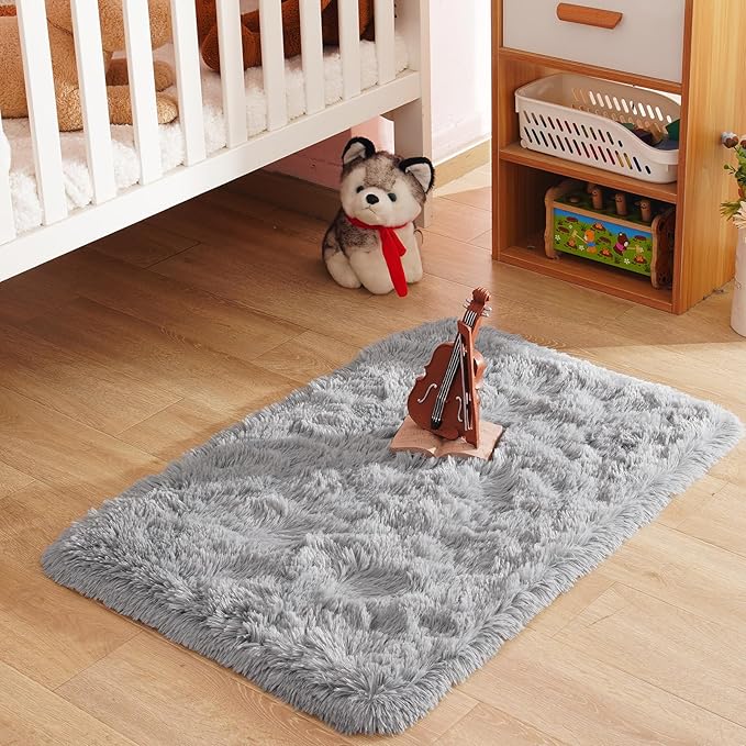 Small Bedside Rug, 2x3 Non Slip Fluffy Shaggy Entryway Throw Rugs for Bedroom Living Room, Indoor Floor Carpet for Kids Girls and Boys, Nursery Rooms Mat, Home Decor Aesthetic, Light Grey