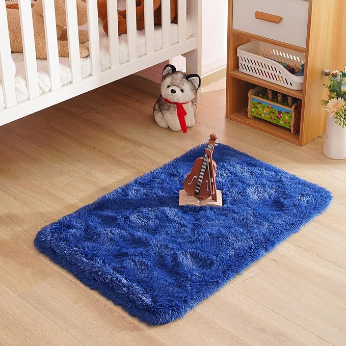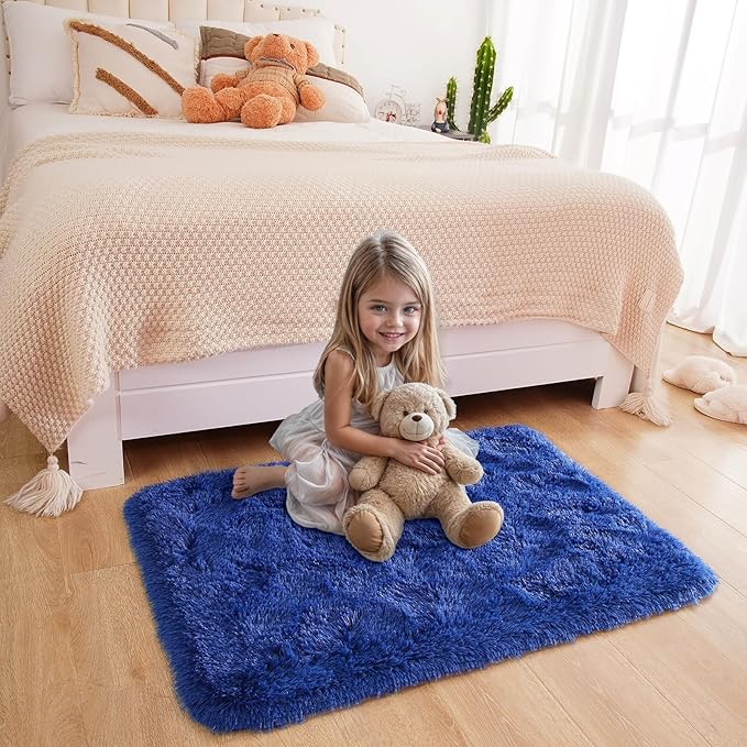 Small Bedside Rug, 2x3 Non Slip Fluffy Shaggy Entryway Throw Rugs for Bedroom Living Room, Indoor Floor Carpet for Kids Girls and Boys, Nursery Rooms Mat, Home Decor Aesthetic, Blue