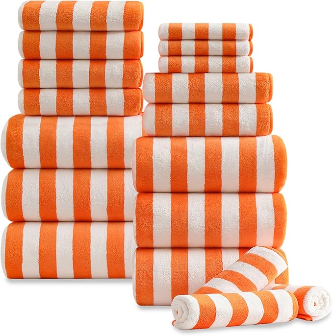 18 Pcs Orange Cabana Stripe Family Towels Set with Hanging Loop-6 Bath Sheets,6 Hand Towels,6 Washcloths Ultra Soft Bathroom Towel Highly Absorbent Quick Dry Shower Towel for Beach Chair,Spa,Gym,Hotel