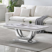 SSLine Rectangular Faux Marble Coffee Table for Living Room Modern Luxury White Marble Center Table with Silver Dual U-Shape Base 46.8" Mid-Century Cocktail Table with Mirrored Stainless Steel Frame