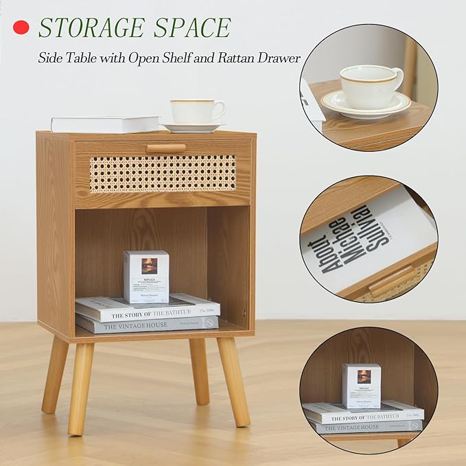 Mid Century Modern Nightstand, Rattan Bedside Table with Drawer and Open Shelf, Wood Nightstand Modern Side Table for Living Room, Bedroom and Small Space, Brown