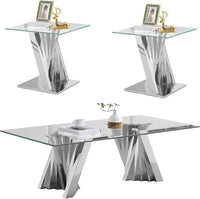 Glass 3 Piece Living Room Table Sets,3-Piece Table Set Includes 1 Glass Coffee Table and 2 End Tables with Stainless Steel Frame,Modern Coffee Table Set of 3 for Living Room (Silver) Sale