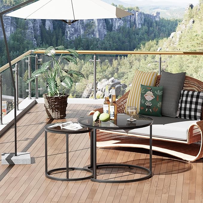 aboxoo Nesting Coffee Table Grey Glass Table Set of 2, Small Round Glass Nesting Tables for Living Room Bedroom, Accent Tea Table with Metal Frame Modern Industrial Simple