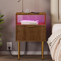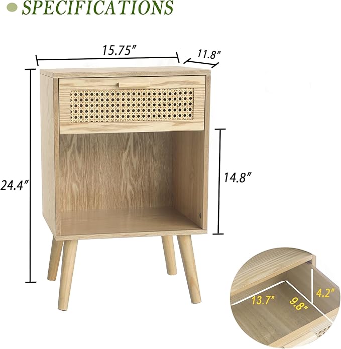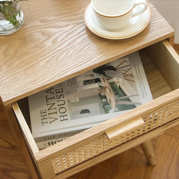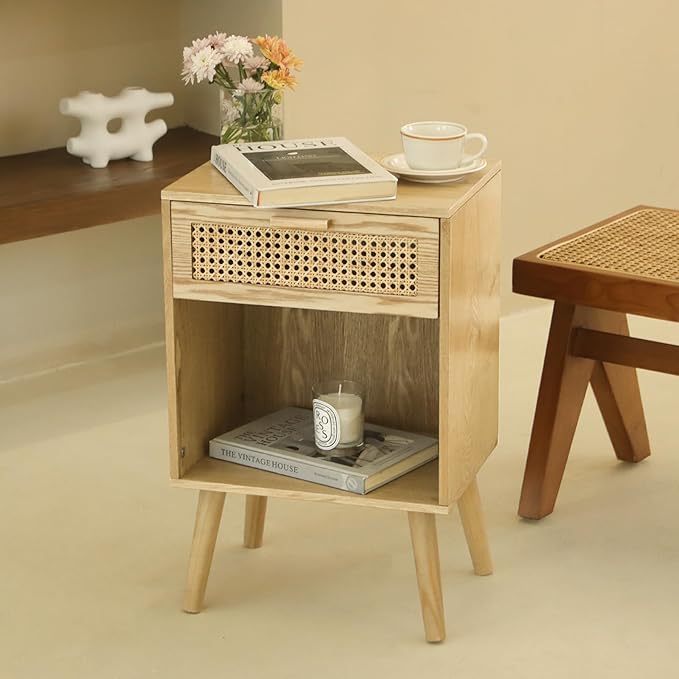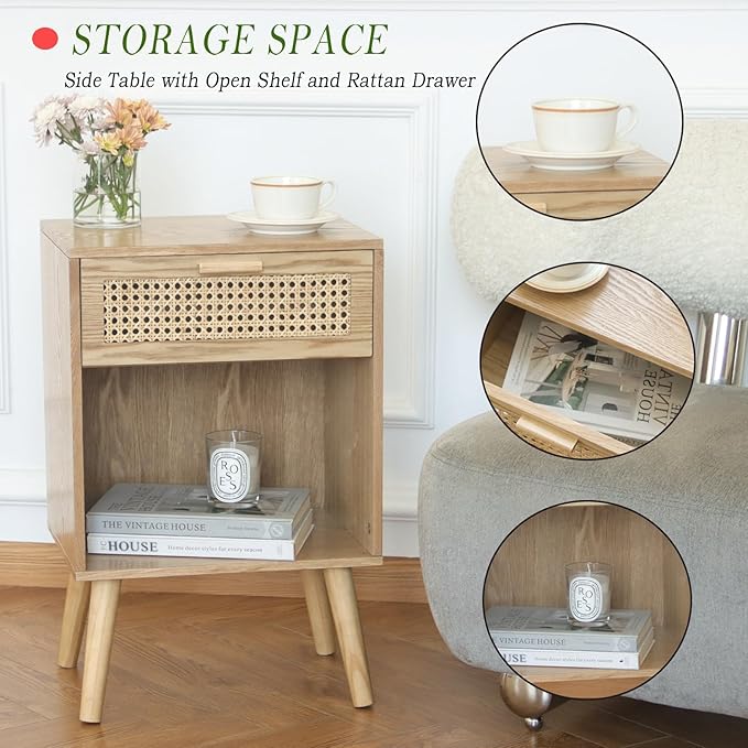 MaxSmeo Rattan Side Table, Small Bedside Tables Natural Wood Nightstand with Drawer and Open Shelf, Modern Nightstand with Solid Legs (Natural Walnut)