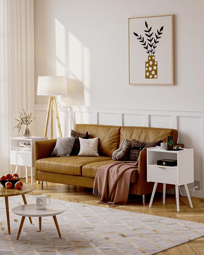 White Nightstand with Outlet,Modern Bedside Table with Storage Drawer and Open Wood Shelf, for Living Room, Bedroom and Small Spaces, Accent Night Stand with Solid Wood Legs, Easy Assembly