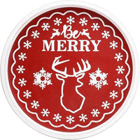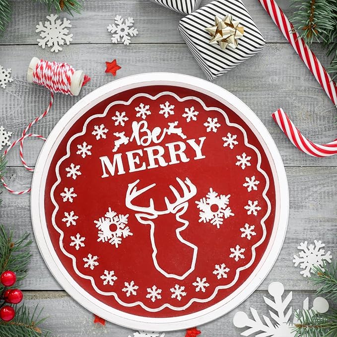 Christmas Reindeer Wood Decorative Ottoman Tray for Coffee Table Kitchen Counter, Living Room, Round Handcrafted Red Wooden Serving Tray for Table Centerpiece