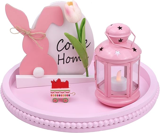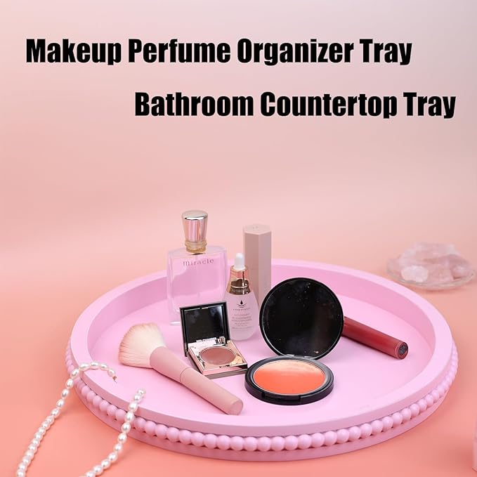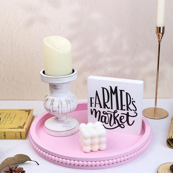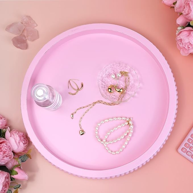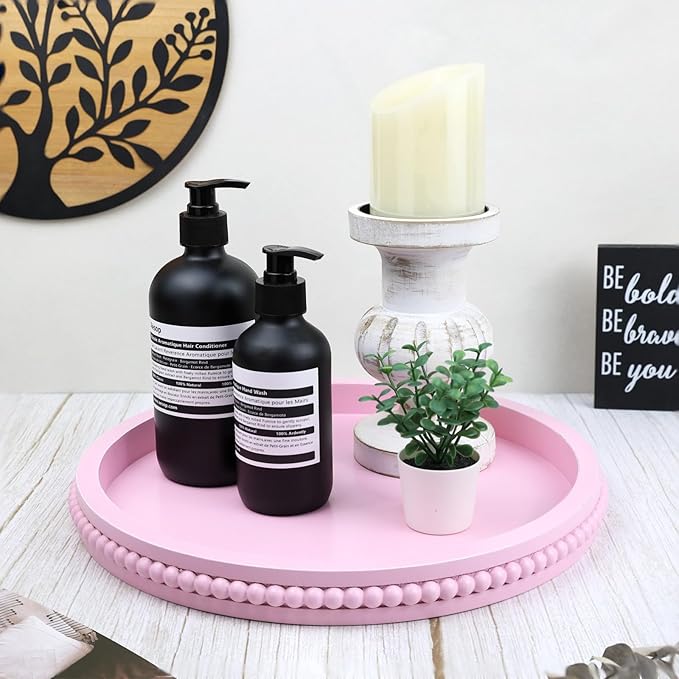 Pink Round Wood Decorative Ottoman Tray for Coffee Table Kitchen Counter, Living Room, Handcrafted Wooden Serving Tray for Table Centerpiece