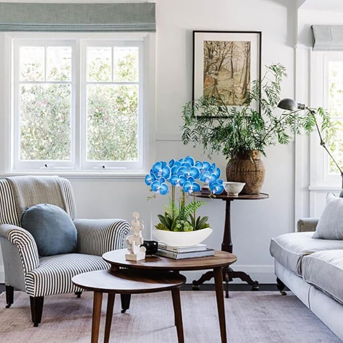 Briful Blue Orchid Artificial Flowers 18in Fake Orchid Silk Flowers with Ceramic Pot Faux Orchid Arrangement for Home Office Room Coffee Table Shelf Modern Decoration