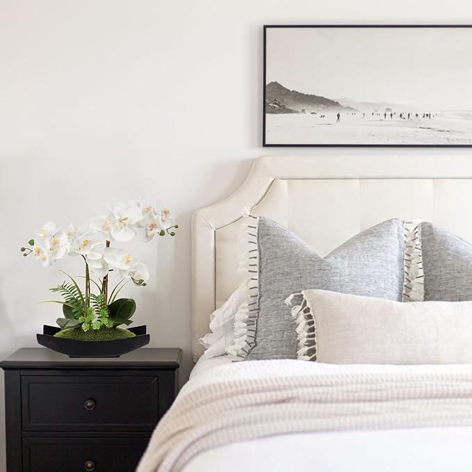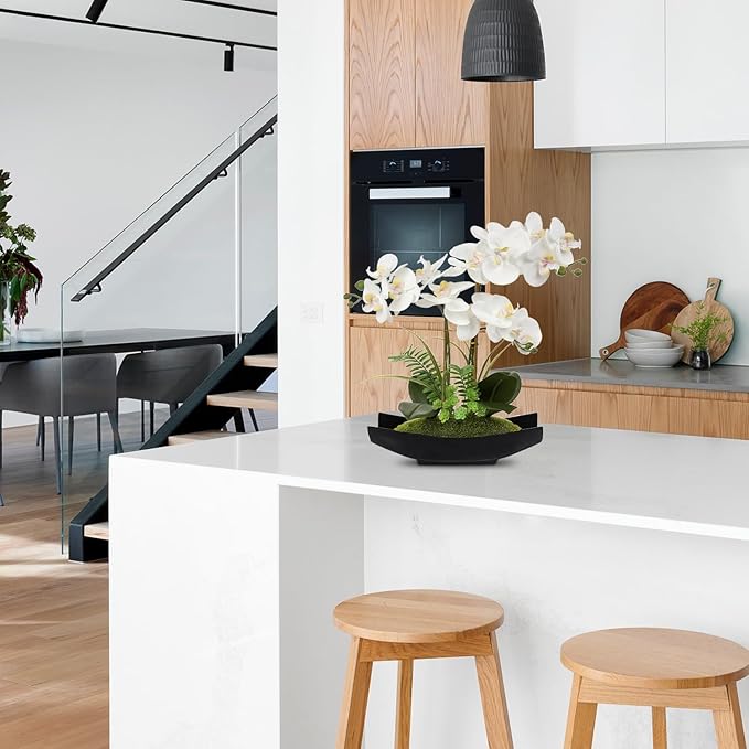 Briful Orchid Artificial Flowers 15in White Fake Orchid Silk Flowers with Black Pot Faux Phalaenopsis Arrangement for Home Office Room Table Centerpiece Modern Decor
