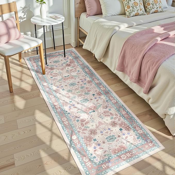 Pink Floral Runner Rug 2x6 for Kitchen Hallway Bedroom Deerly Vintage Boho Washable Bathroom Runner Rugs Non-Slip Soft Low Pile Thin Indoor Carpet for Laundry Room Farmhouse Rug, Light Pink/Blue/Multi