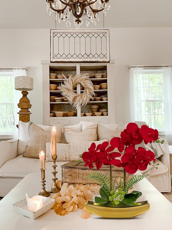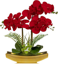 Briful Orchid Artificial Flowers 17" Silk Red Orchid Floral Arrangement with Gold Pot Real Touch Faux Orchid Plant for Home Office Room Kitchen Table Centerpiece Shelf Decor
