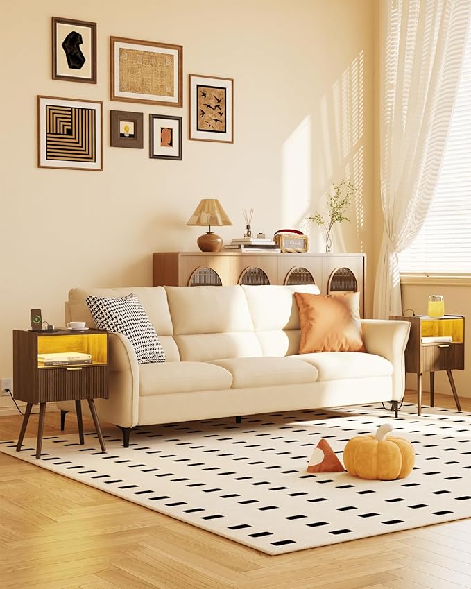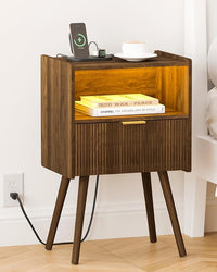 Nightstand, Modern Bedside Table with Charging Station and LED Lights, Night Stand with Storage Drawer and Solid Wood Legs