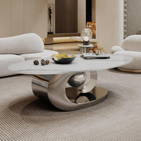 Modern Oval Sintered Stone Coffee Table, 49.2" White and Silver Rectangle Coffee Table with Faux Marble Top & Golden Geometric Stainless Steel Base, Rectangle Tea Center Table for Living Room