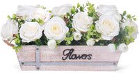 Centerpiece Table Decorations Rustic Wood Tray with 3 Artificial White Rose Flowers and Fake Eucalyptus for Dining Room Farmhouse Living Room Kitchen and Coffee Table Décor