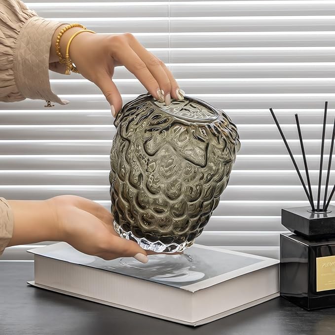 Grape Bubble Glass Vase for Flowers, Round Vintage and Clear Black Colored Smoke Glass Vases for Modern Home Decor (Crystal Grey 6" W X 6.7" H)
