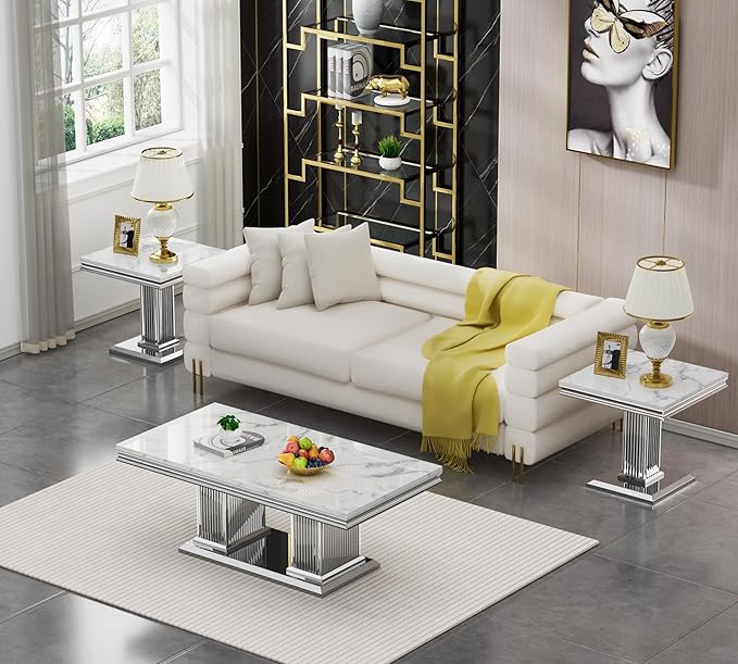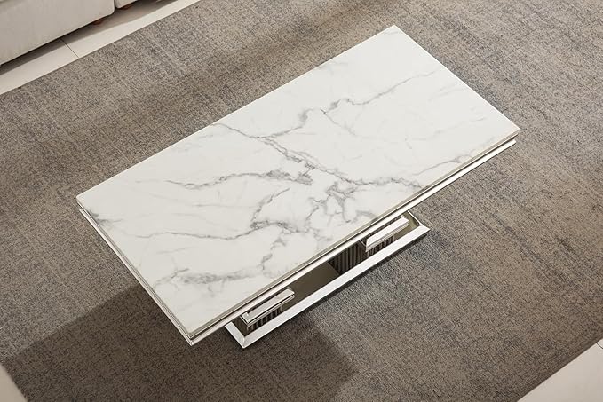 SSLine Rectangular Faux Marble Coffee Table for Living Room Modern Luxury White Marble Center Table with Silver Pedestal Base 46.8" Mid-Century Cocktail Table with Mirrored Stainless Steel Frame