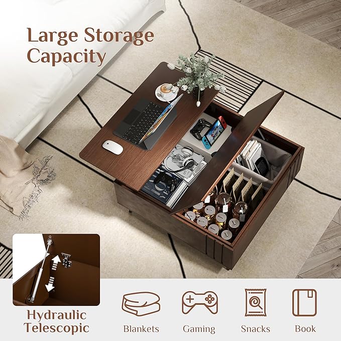 Lift Top Coffee Table, Mid Century Modern Center Table with Large Hidden Storage Compartment, 36" Square Coffee Tables for Living Room, Home Office, Dark Walnut
