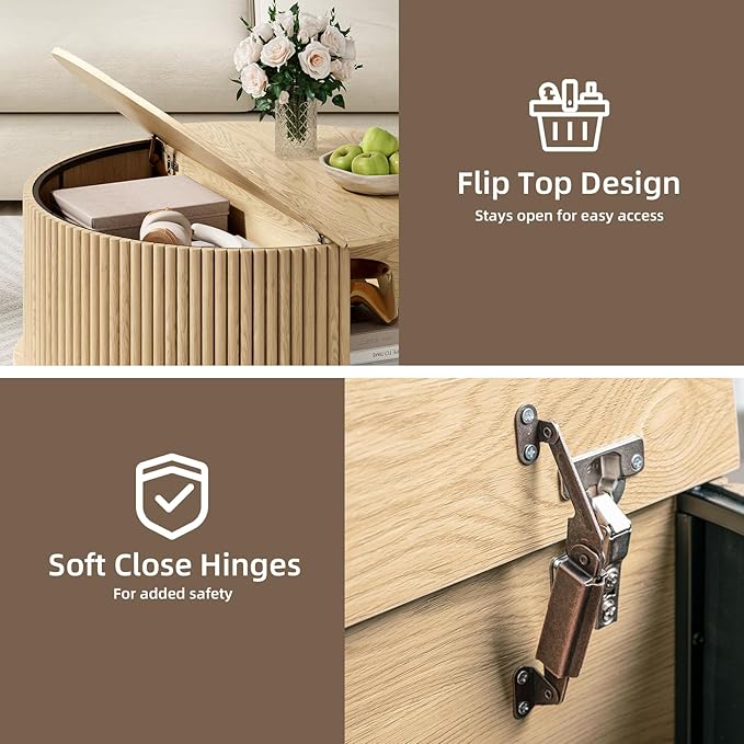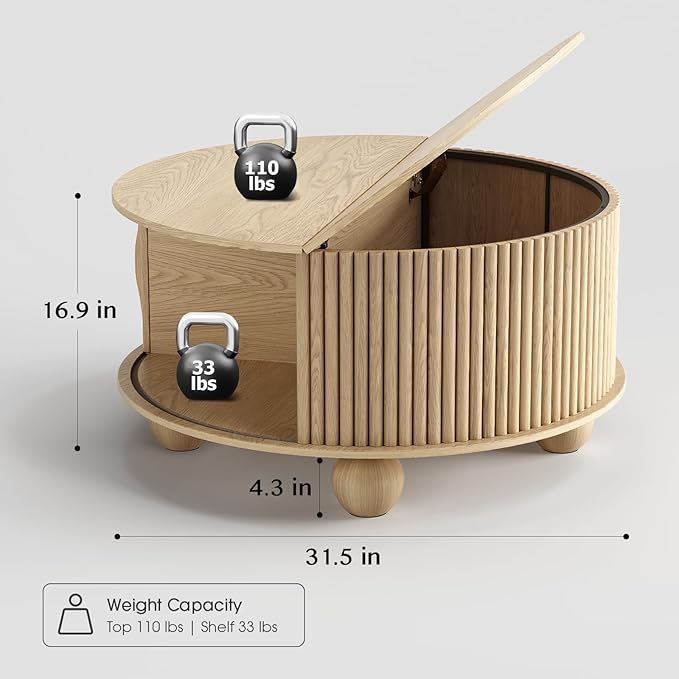 Round Coffee Table with Storage,31.5" Mid Century Modern Coffee Table with Bun Feet,Fluted Center Table for Living Room,Home Small Space,Oak