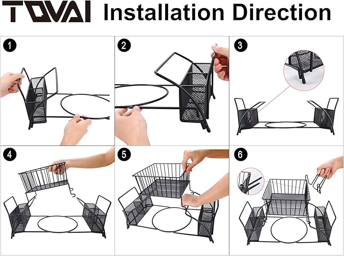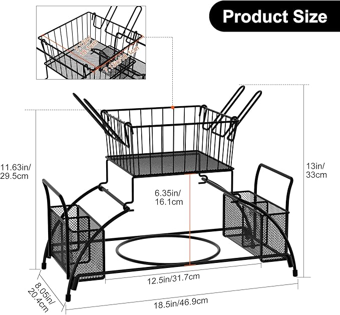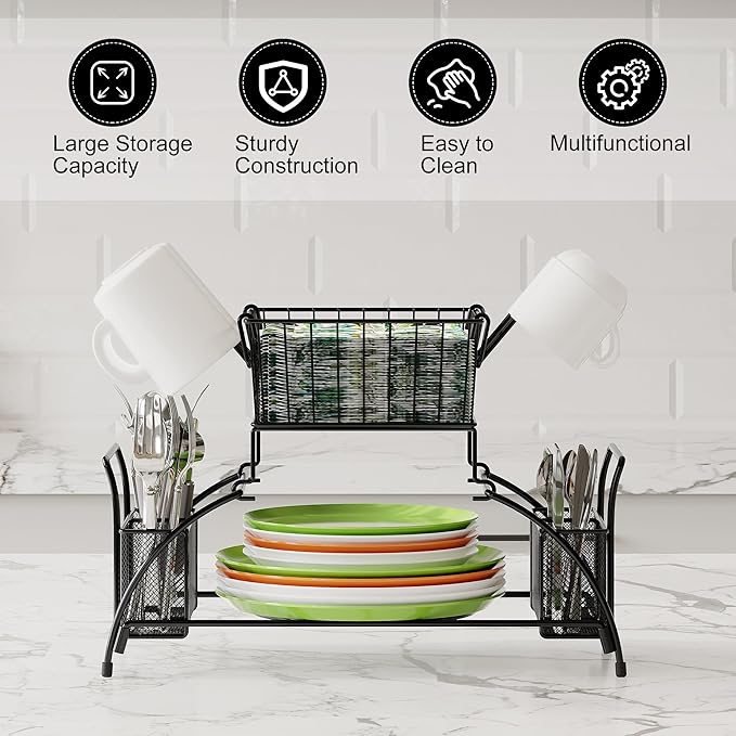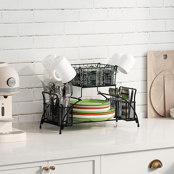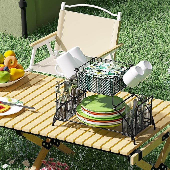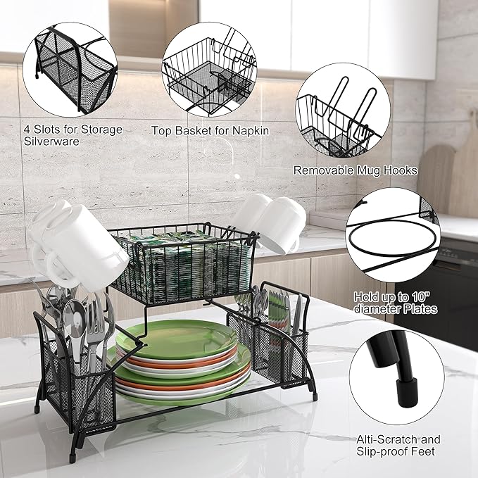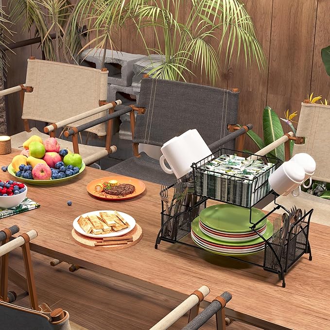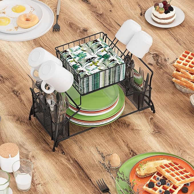 TQVAI 2 Tier Buffet Caddy Silverware Flatware Organizer with Mug Holder for Plates, Utensils, Napkins - Ideal for Kitchen, Dining, Entertaining, Parties, Picnics, Black