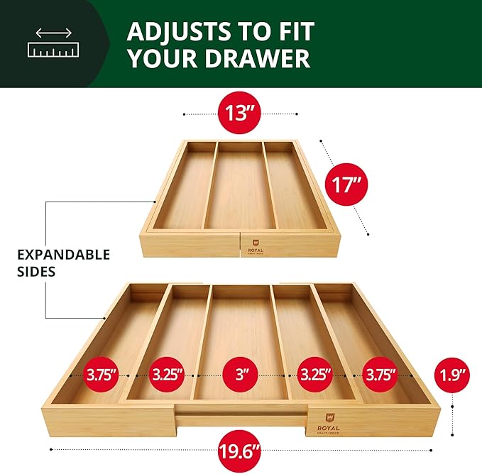 ROYAL CRAFT WOOD Luxury Bamboo Kitchen Drawer Organizer - Silverware Organizer - Utensil Holder and Cutlery Tray with Grooved Drawer Dividers for Flatware and Kitchen Utensils (5 Slot, Natural)