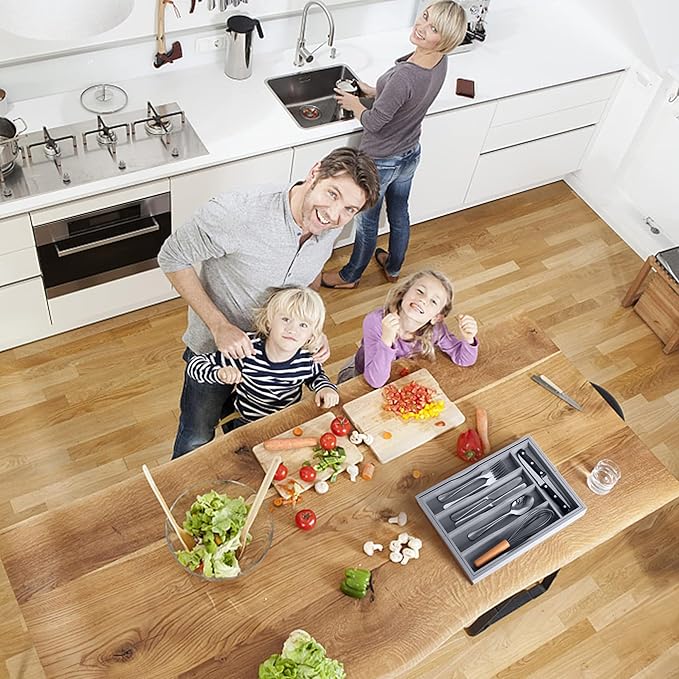 Expandable Bamboo Kitchen Drawer Organizer for Cutlery and Utensils, Adjustable Bamboo Wood Cutlery Tray in Drawer for Flatware and Silverware in Kitchen, (Grey)