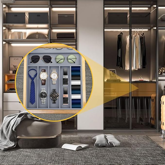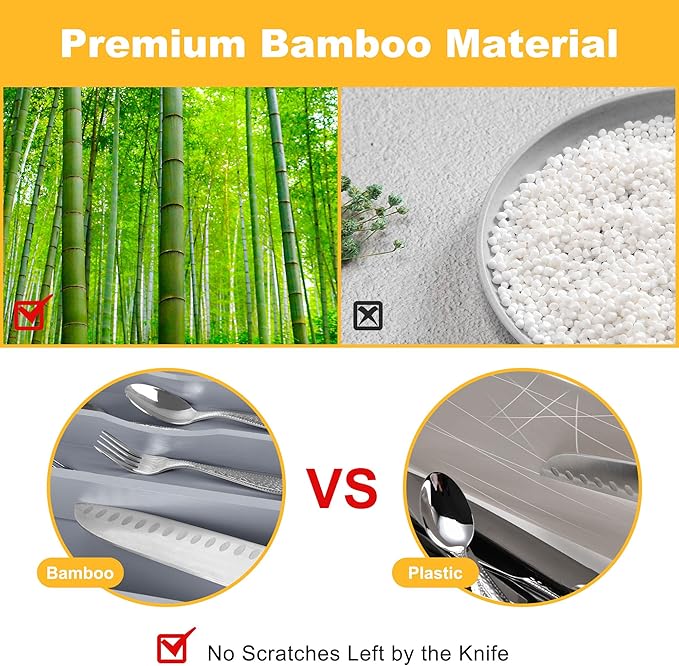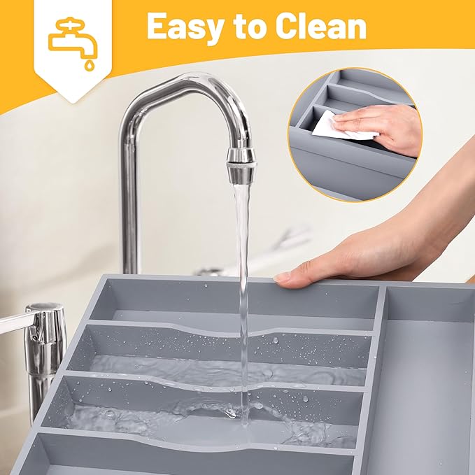 Kitchen Bamboo Silverware Organizer, Kitchen Drawer Organizer - Utensil Holder and Cutlery Tray with Grooved Drawer Dividers for Flatware 7 Slot, Grey
