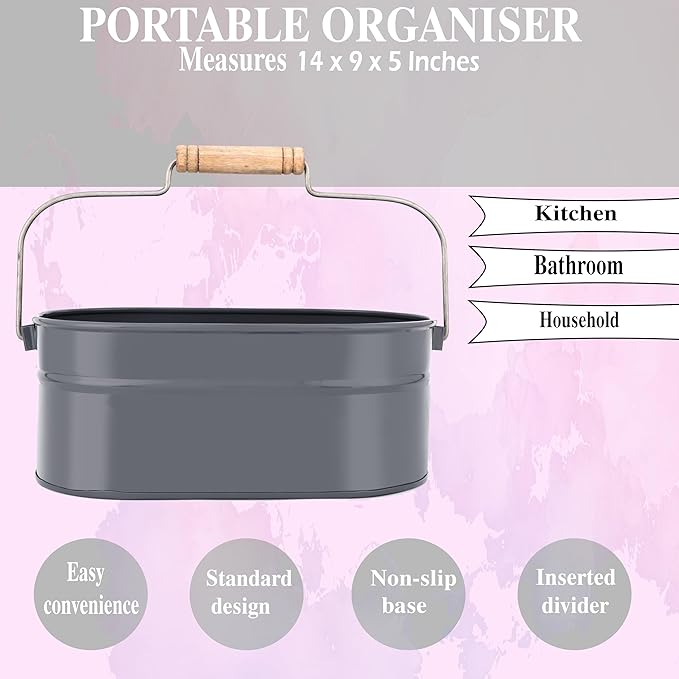 Alpha Living Home Silverware Caddy with Handle, Mulip-pose Organizer for Kitchen, Farmhouse Caddy Organizer - 4-Compartment Iron & Wood Handle Cutlery Holder, Office & Bathroom Storage, Grey