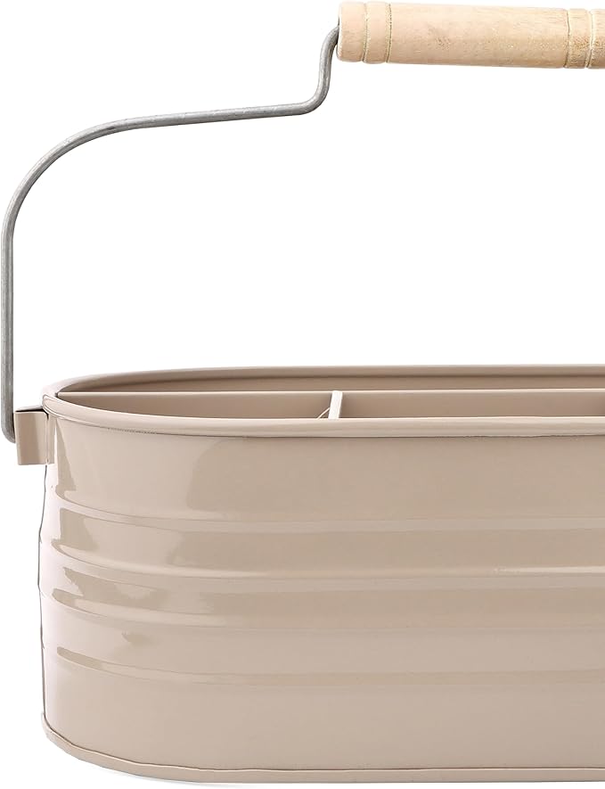 Alpha Living Home Multi-Functional Utensil Caddy – 4-Compartment Organizer for Kitchen, Party & Office – Durable Beige Powder-Coated Iron Alloy with Wooden Handle