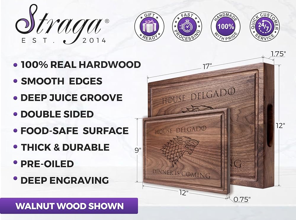 Straga Personalized House Stark Cutting Board - "Dinner is Coming" Engraved Design - Best Game of Thrones Gift for Fans, Couples, Parents - Christmas, Birthday, Anniversary - USA Made 056