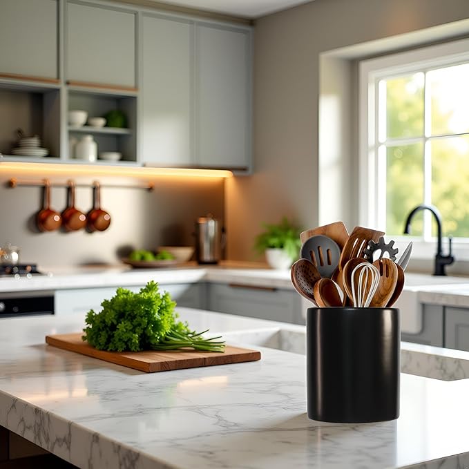 Black Utensils Holder, Caddy Cutlery Holder Silverware, Utensils Organizer Elegant Black Porcelain, Spoon Holder for Party Tableware Holder for Kitchen Table