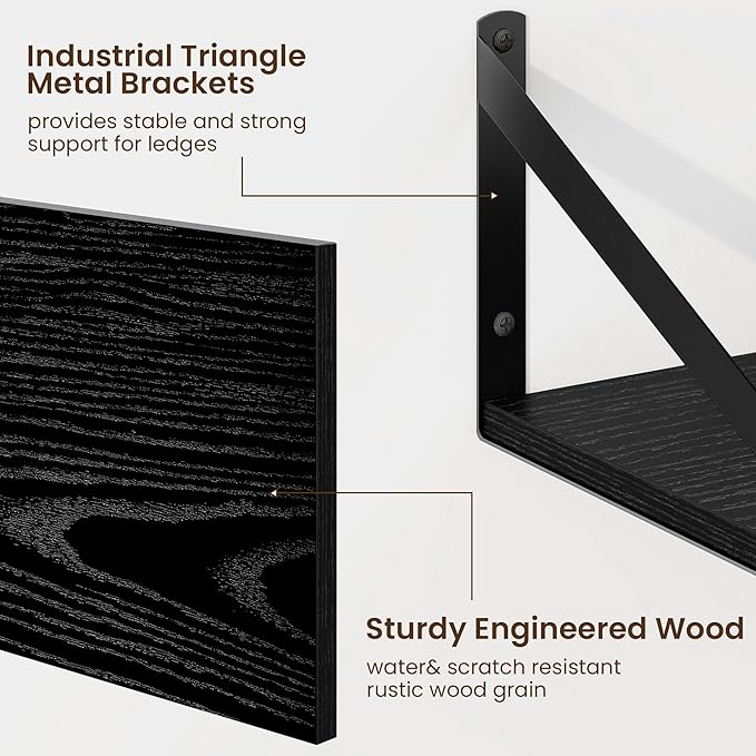 Fun Memories Floating Shelves for Wall, 12 Inch Deep Floating Shelves Set of 2, 24W x 12D Large Wall Shelf with Sturdy Metal Brackets for Living Room, Bathroom, Bedroom and Kitchen, Black