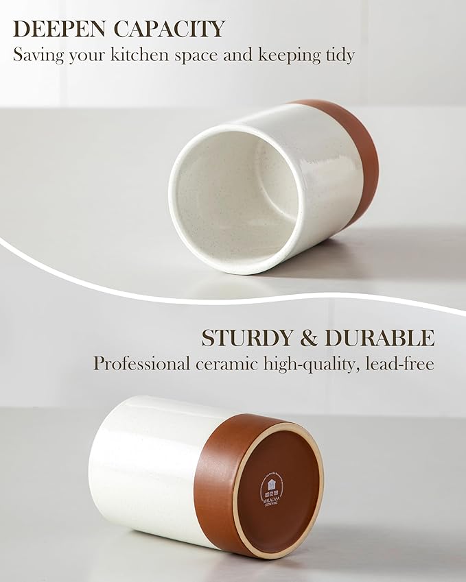MALACASA Utensil Holder, 5.5" Ceramic Kitchen Utensil Holder for Countertop, Cooking Utensil Crock for Kitchen Counter, Farmhouse Utensil Organizer for Spatula & Spoon, Khaki White, Series TARA