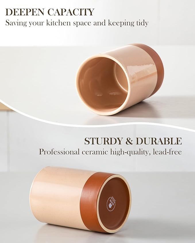 MALACASA Utensil Holder, 5.5" Ceramic Kitchen Utensil Holder for Countertop, Cooking Utensil Crock for Kitchen Counter, Farmhouse Utensil Organizer for Spatula & Spoon, Khaki Pink, Series TARA