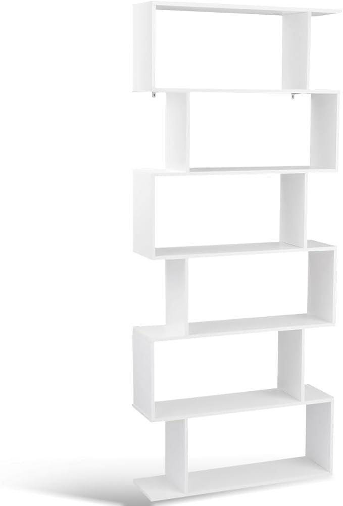 Tangkula 6-Tier Geometric Bookcase, Modern S-Shaped Storage Display Bookshelf for Living Room, Anti-Toppling Device, Home Office Wooden 6 Shelf Open Bookcase (1, White)