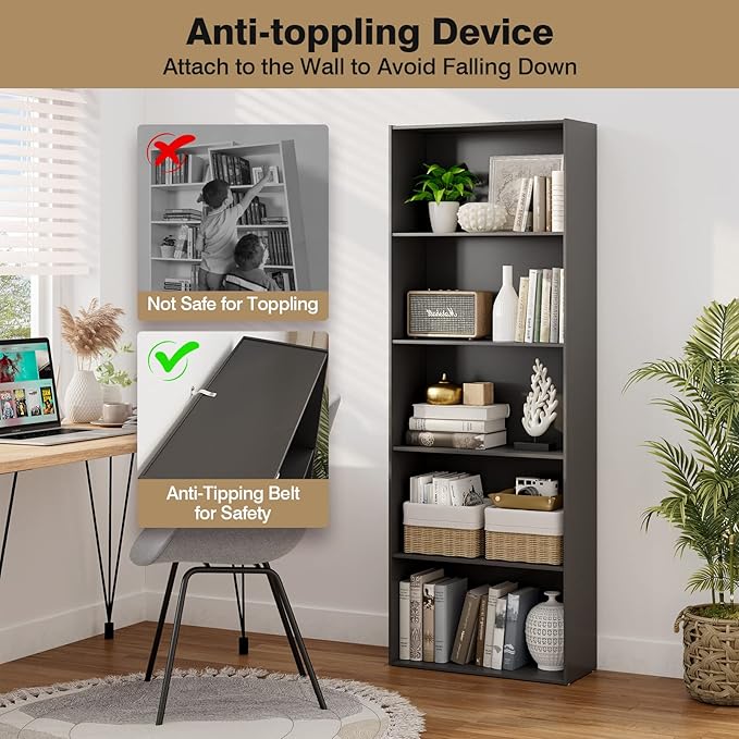 Tangkula 5-Tier Bookcase, 67” Tall Freestanding Bookshelf with 5 Open Shelves, Anti-Toppling Kits, Floor Display Storage Organizer for Living Room, Study, Kitchen, Home & Office (Black, 67" H)
