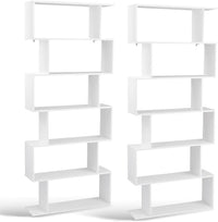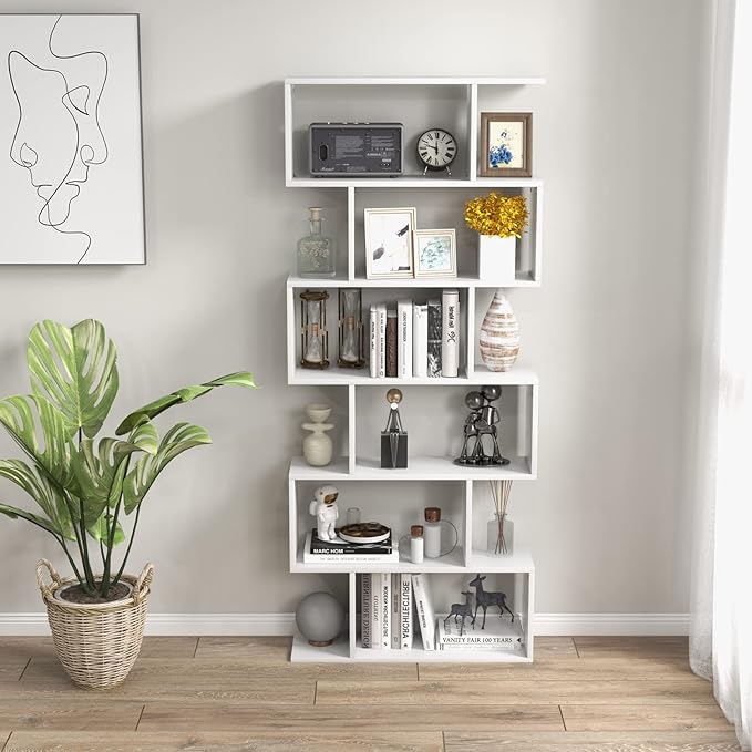 Tangkula 6-Tier Geometric Bookcase, Modern S-Shaped Storage Display Bookshelf for Living Room, Anti-Toppling Device, Home Office Wooden 6 Shelf Open Bookcase (2, White)